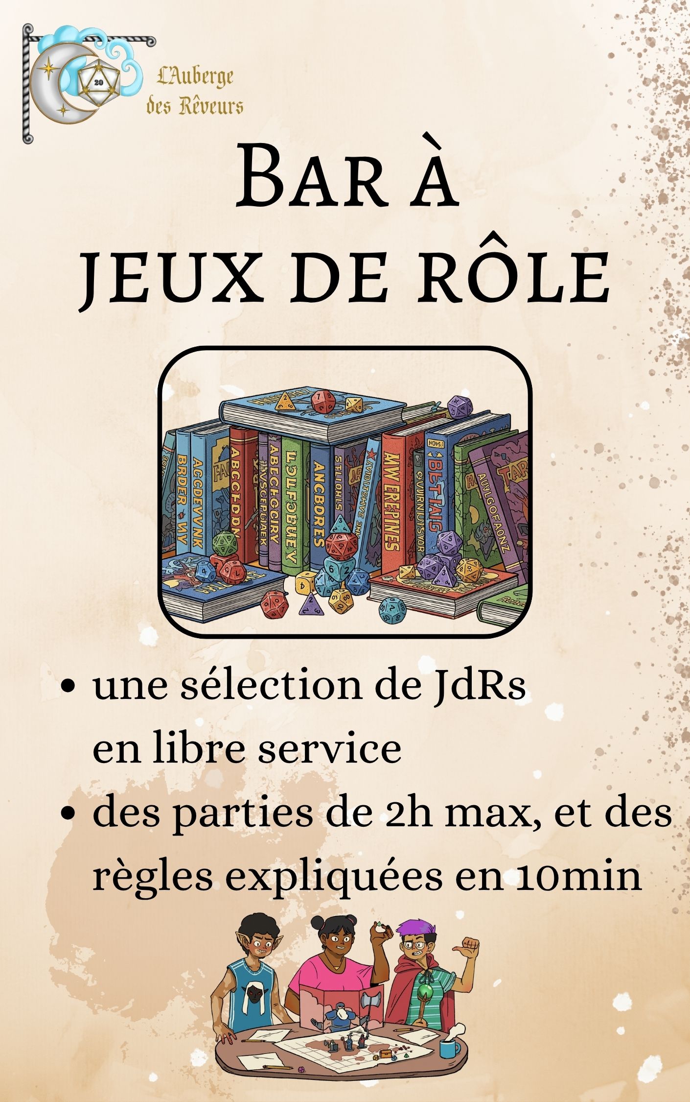 Sur le même principe qu’un « bar à jeux de société », nous vous proposerons un « bar à jeux de rôle » lors du festival !